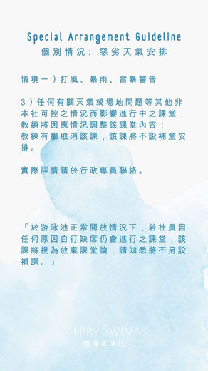 若遇個別情況 如公眾假期、泳池舉行比賽、社會環境、出席社員人數不足等情況,該課將安排順延一星期作指定補課日期。